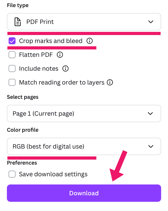 3. Izvēlies faila formātu "PDF Print", atzīmē "Crop marks and bleed", un visbeidzot izvēlies Color profile --> RGB. Spied Download.