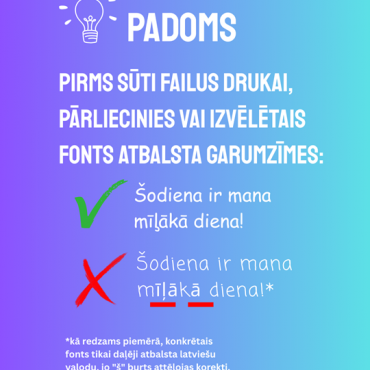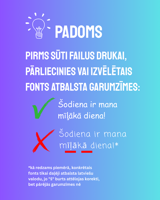 Draudzīgs padoms - vienmēr pārliecinies vai izvēlētais teksta fonts pilnībā atbalsta latviešu valodu (garumzīmes). Mēdz būt fonti, kuriem šo ir ļoti grūti pamanīt, tādēļ esiet vērīgi.